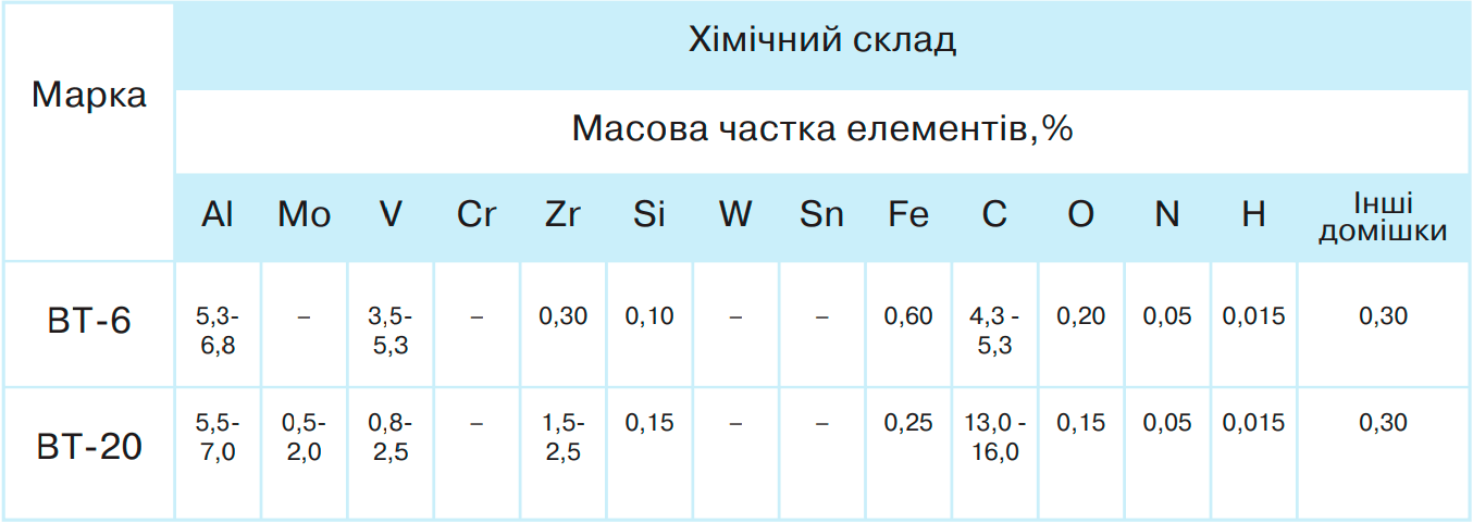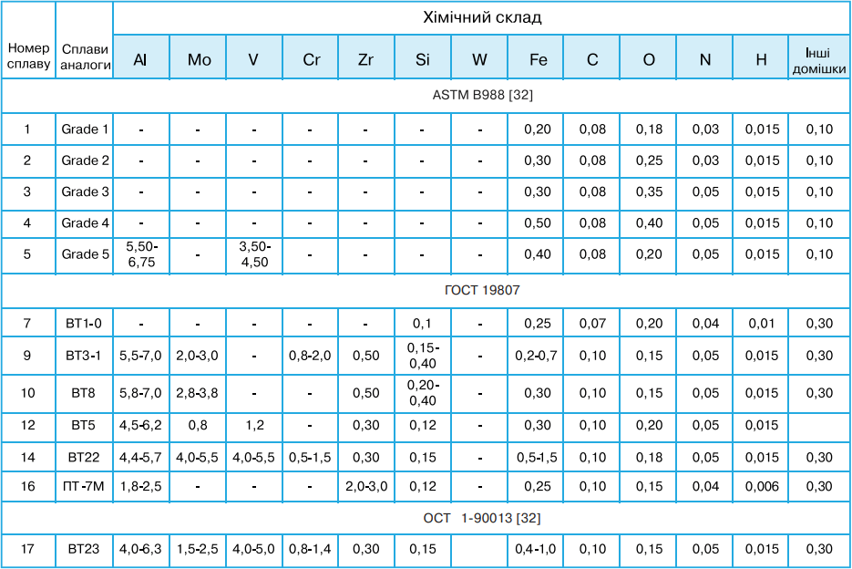 Масова доля елементів максимальна, якщо не наведено границь. Допускається на вимогу замовника інший вміст домішок. (Наприклад, Grade 5 із вмістом кисню не більше 0,15%; нітрогену – 0,040%; водню – 0,012%; заліза – 0,25%.)