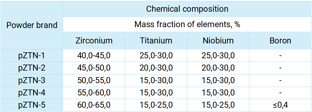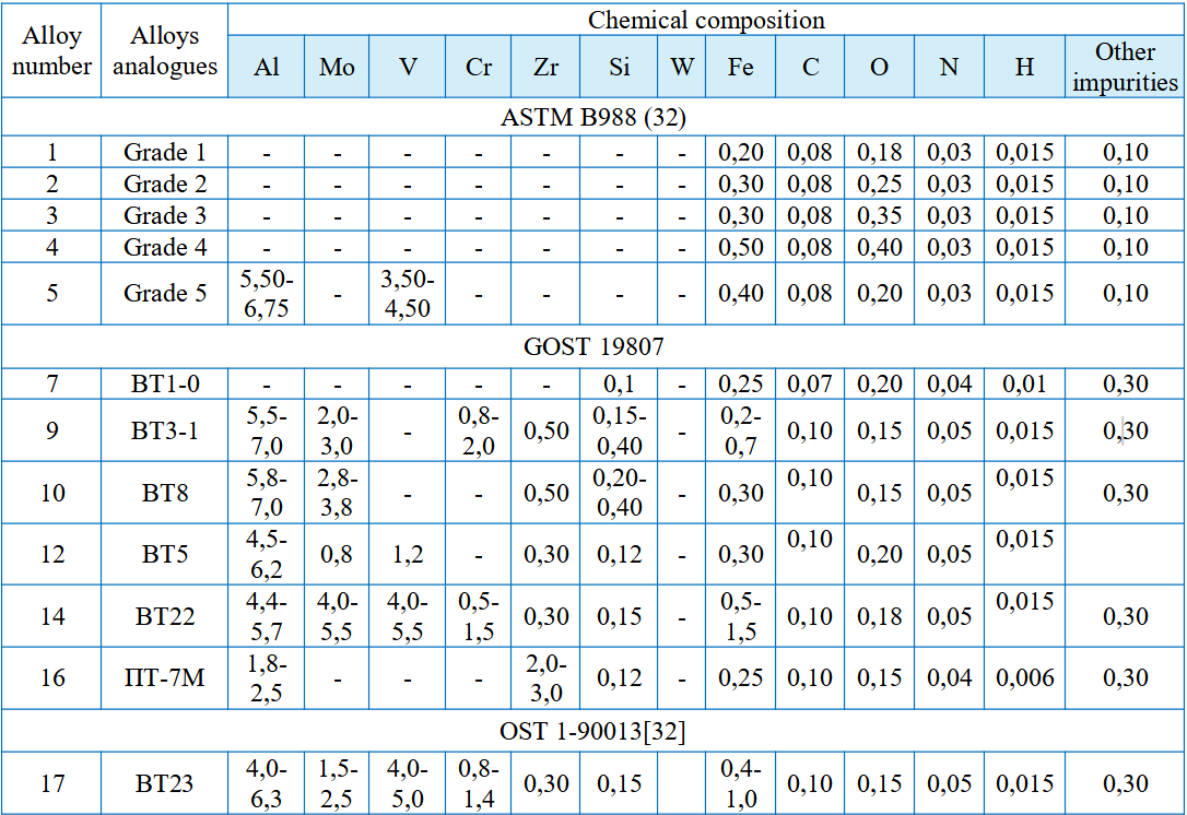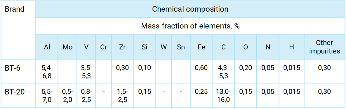 The mass fraction of elements is maximum, if no boundaries are given. Other impurity content is allowed at the customer’s request. (For example, Grade 5 with an oxygen content of not more than 0.15%; nitrogen – 0.040%; hydrogen – 0.012%; iron – 0.25%.)